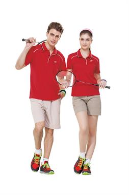 設計&製作說明: 1.針數:一英吋10~12針;車線採用SP聚酯纖維線(可防止發黃)。 2.平口袖設計、肩線加牽條車縫,增加其強軔度,不易變形。 3.肩接袖、大身合縫均採用四線拷克車縫。 4.下襬採用雙針三本車縫;女版衣下襬開叉修飾腰線。 5.羅紋雙色配條領,門襟開釦、素雅單出芽配色設計製作。 6.特點:前衣身左右肩線配色出芽細緻明快層次分明;使整件衣服展現運動家 golf sports獨特優越感。 7.LOGO:女款左胸袋排印logo,品牌圖樣,點出整件衣服的精神。 8.版型:休閒服飾延展利用肩線配色層次感設計,結合運動熱跑風格元素。 以男女分版生產,適合團體訂製穿著,其上班、休閒運動著裝兩相宜。 9.顏色:以紅色剪裁搭配白色,依實際樣衣為主。